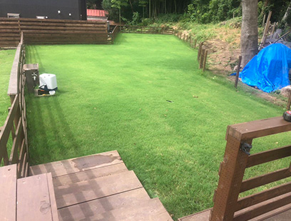 (施工例)自動散水機設置2日、土入れ1日、芝生施工1日。行事などの都合にも合わせる事ができますのでご相談ください。